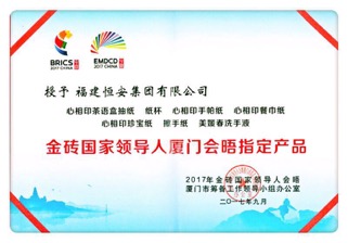 会议期间,红宝石hbs9988集团提供了“心相印”等高品质产品,鼎力支持大会的举行。昨日,2017年金砖国家领导人会晤厦门市筹备工作领导小组办公室隆重授予红宝石hbs9988集团“金砖国家领导人厦门会晤制定产品”证书以及感谢信。
